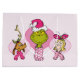 This delightful illustration brings together the full Grinch crew—the Grinch, Max the Dog, and Cindy Lou Who—in a sweet, non-traditional style! The Grinch is front and center with a mischievous smile, sporting a pink Santa hat and polka dot scarf. He's flanked by Max (in antlers) and Cindy Lou Who (in her red bow), both wearing matching pink scarves. The pink heart shapes behind each character emphasize a whimsical, loving, and totally unique holiday (or even Valentine's Day) spirit!