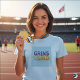 Das auffällige Design des T - Shirt zeichnet sich durch den Begriff "Grins for Gold" in einem lebendigen, vielfarbigen Farbverlauf aus. Jeder Buchstabe wechselt nahtlos in den nächsten und schafft so einen dynamischen und fröhlichen Look.