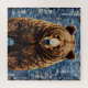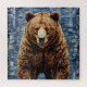 Lebhafte Kunstwerke, die einen Bären mit einem reichhaltigen, strukturierten Pelzmantel darstellen, Set vor einem Flickwerk in Blau- und Grautönen. Der Bär ist imposant und lebensecht und erobert die Aufmerksamkeit mit seinen realistischen Merkmalen.