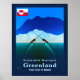 Wale mit Speeren. Ein traditionelles Poster-Bild von zwei männlichen Narwal (Monodon Monoceros) "Tusking", Kreuzung ihrer Stoßzähne, mit Meereis und dem Festland von Grönland im Hintergrund. Außerdem erscheint Text mit "Grönland" und "Kalaallit Nunaat" (Grönland auf Grönland). Die grönländische Flagge, die die untergehende Sonne darstellt, die vom Ozean reflektiert wird, erscheint oben links. Passen Sie Ihren eigenen Text an. Der Zweck des Fahrens, eine gemeinsame Tätigkeit während der wärmeren Jahreszeiten, ist unbekannt. Es kann ein freundlicher Gruß oder eine Möglichkeit sein, Läuse zu entfernen, die typischerweise die Basis des Stoßes infizieren. Selbst der eigentliche Zweck der Spirale ist nicht sicher. Es kann dem gleichen Zweck dienen wie Hirsche und Elchköpfe, die Pfauenfedern oder die Mähne eines Löwen - um einen Partner zu gewinnen. Einige Forscher glauben, dass es als Sinnesorgan dienen kann. Vielleicht dient es mehr als einem Zweck.