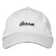 Groom Cap in Weiß mit Schwarz bestickter Text gezeigt. Passen Sie dieses Objekt an oder kaufen Sie, wie es ist.