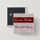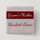 Ein weich gefärbter Rosenstrauß, der über und unter dem Text "Groom's Mother" steht. Der Titeltext ist in einem knackigen Weiß auf einem reichen roten Hintergrund. Der Beispielname ist in einem reichen Rot. Ein perfektes Button für eine Hochzeitsfeier, um die Familienmitglieder oder die Mitglieder der Hochzeitsfeier zu identifizieren.