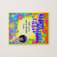 Spaß und farbenfrohe 8" x 10" Rätseleinladung mit dem Text "Groovy Birthday Party" im lustigen 60er-Stil gedruckt auf einem orangen, gelben, grünen und blauen Hintergrund mit einer Vielzahl von 70er-Blume-Bildern. In der unteren rechten Ecke befindet sich eine Frau mit einem großen Ohrring, der ein Martini-Glas anzieht. Passen Sie Ihre Party an. Entdecken Sie die gesamte Sammlung des Disco 70er Puzzle in den AKTIVITÄTEN | Abschnitt "Rätsel".