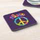 Das Retro-Look Untersetzer Set der 70er Jahre zeichnet sich durch ein großartiges gefärbte Krawatte-Friedenssymbol mit abgerundetem Text auf dunkelrotem Hintergrund aus