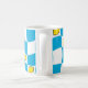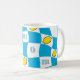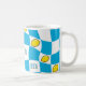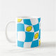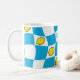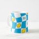 Groovy 70s mug with vibrant distorted checkerboard and lemons design. Featuring a playful pattern of sunny sky blue and crisp white squares, interspersed with fun lemon motifs, this mug is a perfect nod to the kitsch kitchen aesthetic of the era. Its retro charm makes it an ideal addition to your morning coffee ritual or a delightful accent piece of dopamine decor for your home. Enjoy a touch of nostalgic fun with every sip. Mom is editable for short names or initials.