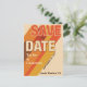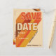 Eine groovy Save the Date Postkarte mit dem Gefühl eines Konzertposters. Der lange Schattentext mit diagonalen Streifen in verschiedenen Farben dehnt sich über die Karte aus und betont die Save the Date angezeigte Botschaft. Ein einzigartiger und wirklich cooler erster Eindruck für Ihre Hochzeit mit Retro-Villen - wenn Ihre Gäste diese Postkarte bekommen, wissen sie, dass der Spaß voraus ist. Kühne Typografie. Authentische 70er-Jahre-Farben: Orange, Rot und Braun. Kühne Retro-Typografie für ein Retro-70er-Gefühl. Die Rückseite der Karte ist orange mit gestreiften Akzenten an den Ecken, ein Ort, an dem Sie weitere Informationen hinzufügen können, und ein QR-Code, sodass die Gäste können Sie besuchen Sie Ihre Hochzeitswebsite. Design: Die Chrissie Farben: Creme, Orange, Rot und Braun