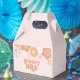 Retro inspiriert Groovy Ein erster Geburtstag Gunst Kästen mit 70er-Stil Blume und boho Schriftart und Farben.