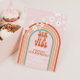 Retro inspiriert Six ist eine lebhafte Einladung zum 6. Geburtstag mit Hippie-Stil Regenbogen, Gänsebläschen und boho Schriftart und Farben.