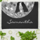 Funky schwarzes kundenspezifisches personalisiertes Küchentuch mit einer schwarzen Silhouette eines groovy Sängertanzens auf einem fabelhaften funkelnden silbernen retro Discoballhintergrund @ www.vectorportal.com fertigen mit Ihrem eigenen Text - Lose Farben u. Schriftart besonders an, um von zu wählen. Ein fantastisches ursprüngliches Geschenk für Jugendliche und funky Musikliebhaber!