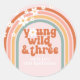 Retro inspiriert Groovy Young Wild und Drei-3. Geburtstag Party Aufkleber mit Hippie-Stil Regenbogen, Gänseblümchen und boho Schriftart und Farben.