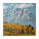 Dieses Foto kennzeichnet eine Aspen-Waldung in den Herbstfarben mit Schnee bedeckten Bergen im Hintergrund, großartiger Teton Nationalpark.