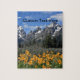Dieses photographische Bild zeigt dem großartigen Teton Nationalparkgebirgsstrecke zu meiner Lieblingszeit des Jahres - Frühling, an einem sonnigen Tag mit klaren hellen blauen Himmeln, einigen wispy weißen Wolken und Schnee auf den Gebirgsspitzen und einem ganzen Bündel goldenen Blumen, die im Vordergrund blühen. Sie können dieses Produkt personifizieren, indem Sie Ihr eigenes Datum, Namen oder Mitteilung addieren.