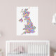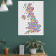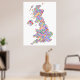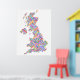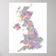 Eine typografische Textkarte von Großbritannien mit über 500 Städten und Städten im Vereinigten Königreich, mehrfarbiger Text auf weißem Hintergrund.