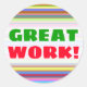 Dieses Aufkleber-Design zeichnet sich durch ein auffälliges Muster von Streifen (oder Linien) in verschiedenen Farben aus. Es enthält auch das ermutigende Sprichwort "GREAT WORK!" in grün und rot. Sticker wie diese könnten vielleicht von Lehrern, Lehrern oder Tutoren verwendet werden, um einen Schüler anzuerkennen und zu ermutigen, der großartige Arbeit an einem Test, Quiz, Papier, Projekt oder anderen akademischen Aufgaben geleistet hat. [~Z0000117]