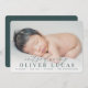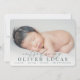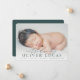 Ein elegantes Geburt-Ankündigungsdesign mit einem vollblutenden, horizontalen oder landschaftsorientierten Foto mit "Einführung [Name]" am unteren Rand in schicken Kalligrafieschrift und klassischer Serifenschrift. Die Geburtsdaten Ihres Babys und Ihre Familiensignatur erscheinen unten. Fügen Sie drei zusätzliche quadratische Fotos auf der Rückseite hinzu.
