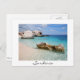 Postcard der großen Felsen im Mittelmeer am Sandstrand von Cala Mariolu, in der Nähe von Cala Luna im Golf von Orosei auf der Insel Sardinien, Italien mit Sardinien in schwarz auf weißem Hintergrund mit dem Text: "Sardinien".
