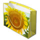 Lassen Sie sich mit diesem großen Geschenksack verzaubern, der das Foto eines großen, gelben Sonnenblumenkopfes zeigt. Die Taschen-Trimmfarbe ist hellgelb. Ein schönes, blumengeschmücktes Design! Wählen Sie Ihren Geschenksackstil aus.