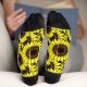 Socken in einem Muster großer goldgelber Sonnenblumen, mit tiefen schokoladenbraunen Zentren, mit schwarzem Akzent