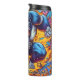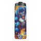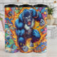 Diese lebendige, im Stil eines Comic gehaltene Illustration zeigt einen massiven, wütenden blauen Gorilla mit einer muskulösen Physik. Der Gorilla wird in einer dynamischen, aktiven Pose erfasst, die aus der Bildmitte zu platzen scheint. Der Hintergrund ist eine chaotische Explosion orangefarbener Blitzschrauben und farbenfroher, grafischer Formen, die eine energetische und kraftvolle Szene schaffen.