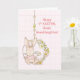 Schicken Sie Ihrer Urenkelin ihre allererste Osterkarte! Dieses süße Kaninchen schwingt auf einem Kranz voller Blume. Sie hält einen Schwanz.