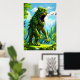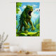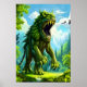 Ein großes grünes Fantasiewesen mit vier Beinen, Schwanz, grünem Fell und vielen scharfen Zähnen im Mund, stehend auf zwei Beinen im Wald, blauer Himmel und weiße Wolke im Himmel. Das ist eine künstlerische KI.