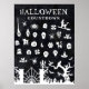 Halloween Countdown Poster. Das Beispiel ist ein großes 30x40 Zoll-Design mit 31 Kalendertagen, die Sie überqueren oder markieren können, wie jeder Tag im Oktober vergeht. Mit verschiedenen Illustrationen wie Spinnen, Schädel, Katzen, Hexenbesen, Tränke, Kerzen, Fledermäuse, Kessel, Geister, ein Friedhof und ein beängstigender Gesichtsbaum.