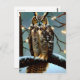 Die schöne künstlerische KI hat eine Postkarte einer großen Horned Eule erstellt, die auf einem schneebedeckten Zweig mit weißen Lichtern in den Bäumen und einem Sternenhimmel-Hintergrund steht.