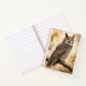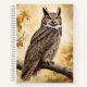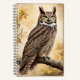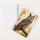Eine majestätische große Hornkeule ist in einem Baum, umgeben von braunen Herbstblättern, auf einem neutralen sandigen Hintergrund, ein schönes Notizbuch, und perfekt für alle, die Eulen, Vögel, Natur und die Natur Lieben.