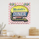 Erstellen Sie Ihr eigenes, individuelles, in den 50er Jahren des 20. Jahrhunderts gestaltetes Dinner-Schild-Plakat mit dieser einfachen Vorlage. Diese coolen Retro-Plakate haben einen leicht bedrückten, rosa-weiß karierten Hintergrund mit einem Schild oben, auf dem "DINER" und "OPEN" stehen, in Neon mit Platz für Sie, um Ihren eigenen Vor- oder Nachnamen - oder ein anderes Wort, das Sie möchten - hinzuzufügen. Das Zeichen hat auch eine beleuchtete Pfeilgrafik und Platz für Sie, um einen Slogan hinzuzufügen und das Jahr, das Ihr Abendessen, Zuhause Küche oder 50er Thema Bar eingerichtet wurde (oder das Jahr, in dem Ihr Party stattfindet). Es ist alles in Rosa, Weiß, Schwarz, Blau, Gelb, Grau und Rot gehalten. Füllen Sie einfach die diy-Vorlage aus oder klicken Sie auf "Anpassen", wenn Ihr Text lange läuft und Sie möchten Textfarben und Schriftart verändern, verändern oder verändern. Vergessen Sie nicht, die von Ihnen gewollt Plakatgröße zu wählen (quadratische Formen funktionieren am besten für dieses Design).
