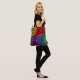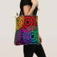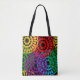 Diese Tote-Tasche hat ein Schwarzes Geschichtsbild von großen Kreisen gebildet, die aus Rindrop-Formen und Kreise in Rot, Gelb, lila, Grün und Türkis gebildet werden.