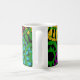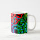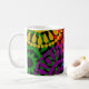 Diese Tasse hat ein Schwarzes Geschichtsbild von großen Kreisen, die aus Rindrop-Formen und Kreisen in Rot, Gelb, lila, Grün und Türkis gebildet werden.