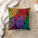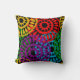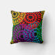 Dieses Kissen hat ein Schwarzes Geschichtsbild von großen Kreisen, die aus Rindrop-Formen und Kreisen in Rot, Gelb, lila, Grün und Türkis gebildet werden.