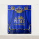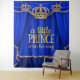 Große Babydusche mit drei schönen Goldkronen auf einem eleganten, königsblauen und goldenen Vorhang. Diese wunderschöne, königsblaue und fürstliche Babydusche ist für Ihre Veranstaltung leicht angepasst. Sie können die kleine Prinzwortgrafik nach Bedarf entfernen und verändern.