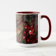 Wiederholung eines roten Fraktals mit halbtransparenten Teilen gegenüber einem weiteren abstrakten Farbbild und helleren Farbtönen.