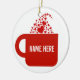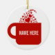 Eine große rote Tasse mit roten Herzen, die von oben kommt.
