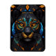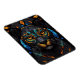 Grosser schwarzer Katzenmosaik Buntglaseffekt Kissen . Farbenfrohe Orangefarbene Augen Set auf einem schwarzen Glasboden mit Blues und grünen Kacheln. Magnet