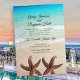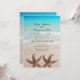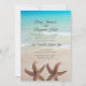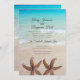 Tropische Hochzeitsfeiern am Strand mit zwei großen Seestern am Boden. Einfache und unterhaltsame Einladung mit einem Hintergrund von türkisblauem Wasser und Strand Sand. Am Ufer brechen kleine Wellen über glattem Sand. Schriftart sind ein modernes Drehbuch für die Namen des Ehepaares und des Ortes. Die Empfang-Zeilen können für einen einfachen "Empfang zu folgen" oder zwei Zeilen verwenden, um eine Adresse oder einen Ort einzuschließen. Das umgekehrte Bild ist die gleiche Szene am Meer. Die Form der Halterung ist optional.