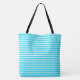 Diese Tasche wird mit einem lustigen türkisfarbenen blau-weiß gestreiften Printdesign gezeigt. Große Größe angezeigt. Hat schwarze Gurte.