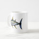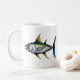 Die dekorative Gestaltung eines großen Thunfischs mit gelben und blauen Flossen, ein tolles Design für Freunde des Fischens und der Meeresfrüchte.