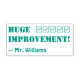 Dieses ermutigende Design der Gummi-Briefmarke beinhaltet die motivierende Feedback-Nachricht "HUGE IMPROVEMENT!" und den Namen eines Tutors. Es enthält auch dekorative Markierungssymbole. Es könnte von einem Lehrer, Pädagogen oder Tutor verwendet werden, um zu bestätigen, dass ein Schüler gut abgeschnitten hat.