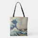 Schöne Tote-Taschen im Überdruck! Erhältlich in zwei Stilen und zwei Größen! 36 Ausblicke auf den Fuji: Die große Welle von Katsushika Hokusai aus der Edo-Periode vor der Küste Kanagawas, c. 1830. Traditioneller Holzschnitt. Vintage Illustration des maritimen Designs mit einem Meerespanorama riesiger Gezeitenwellen mit Menschenschiffen und dem Fuji in der Ferne. Obwohl davon ausgegangen wird, dass es sich um eine Flutwelle handelt, ist sie eher ein Okinami oder eine große Welle.
