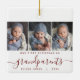 Helfen Sie ihnen, mit diesem schönen modernen Sake-Ornament an das erste Weihnachtsfest ihres Enkels zu erinnern. Der graue Text lautet "Unsere ersten Weihnachten als Großeltern", mit dem Wort "Großeltern" in der eleganten bordeauxroten Schrift mit Schnörkeln vor und nach. Ersetzen Sie die drei Beispielbilder durch Ihre bevorzugten vertikalen Fotos, und fügen Sie den Namen des Babys und das Jahr hinzu.