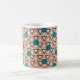 Diese Tasse hat ein geometrisches Design, in dem sich braun und braun wiederholende Dreiecke mit türkisfarbenen Kreisen oben auf einem weißlichen Feld befinden. Das gleiche Design in verschiedenen Farben gewollt? Nachricht.