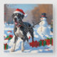 Ein majestätischer Great Dane läuft durch die schneebedeckte Winterszene und trägt einen festlichen roten Weihnachtshut. Dieses auffallende Design vereint den kräftigen Charakter der Rasse, die sanfte Natur und die loyale Persönlichkeit und feiert gleichzeitig die Wärme und den Zauber der Ferienzeit. Ein herzlicher Moment voller feierlichen Beifall.