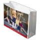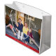 Große rote Weihnachtsgeschenktaschen mit wechselndem Foto und Foto - Sie können Ihr Foto, Familienname und Jahr hinzufügen. Fotografie © Storytree Studios, Stanford, CA