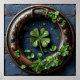 Rundstück mit einem großen vierblättrigen Kleeblatt, umgeben von kleineren Kleen, Set vor einem strukturierten blauen Hintergrund. Der Rundrahmen hat ein Vintages, metallisches Aussehen mit verwitterter Oberfläche und schafft eine harmonische Mischung aus Natur und Kunst.