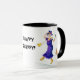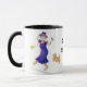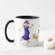 Eine Tasse des weißen Kaffees mit einer schwarzen Kante und Griff, verziert mit einem älteren Frauentanzen und dem Gesang, von einer Wasserfarbemalerei von Judy Adamson. Die Frau wird in den hellen Farben, mit gelben blumigen Stiefeln und einem lila Hut gekleidet. Sie hält ein Mikrofon und ihr kleiner Hund schließt sich das Tanzen an. Der Text, im Schwarzen, das Sie besonders anfertigen können, ist "starke Oma". Grußkarten, -Lesezeichen und -Kühlschrankmagnete mit dem gleichen Entwurf sind auch verfügbar.