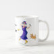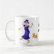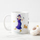 Eine Tasse des weißen Kaffees mit einer schwarzen Kante und Griff, verziert mit einem älteren Frauentanzen und dem Gesang, von einer Wasserfarbemalerei von Judy Adamson. Die Frau wird in den hellen Farben, mit gelben blumigen Stiefeln und einem lila Hut gekleidet. Sie hält ein Mikrofon und ihr kleiner Hund schließt sich das Tanzen an. Der Text, im Schwarzen, das Sie besonders anfertigen können, ist "starke Oma". Grußkarten, -Lesezeichen und -Kühlschrankmagnete mit dem gleichen Entwurf sind auch verfügbar.