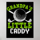 Diese bezaubernde Golf-Thematik-Illustration ist perfekt für einen stolzen Großvater und sein Enkelkind. Der obere Text "GRANDPA'S" wird in einem lebendigen, leicht bedrückten Grün angezeigt. Im Zentrum steht ein großer Golfball, hinter dem zwei gekreuzte Golfclubs in Weiß stehen. Unter dem Golfball befindet sich "LITTLE" in einem passenden Grün, gefolgt von "CADDY" in Weiß. Das Gesamtdesign ist sauber und kühn vor einem soliden schwarzen Hintergrund und feiert die besondere Bindung auf dem Golfplatz.