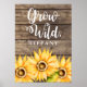 Rustikale und ländliche Kinderzimmer- oder Kinderzimmermauer mit Sonnenblumen, die mit Aquarell auf Holzfußboden bemalt sind. Im Text steht "Grow Wild" im whimsical script Schriftart. Passen Sie dieses Produkt an, indem Sie den Namen Ihres Kindes hinzufügen.